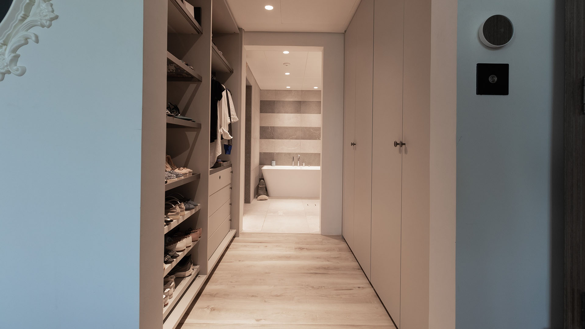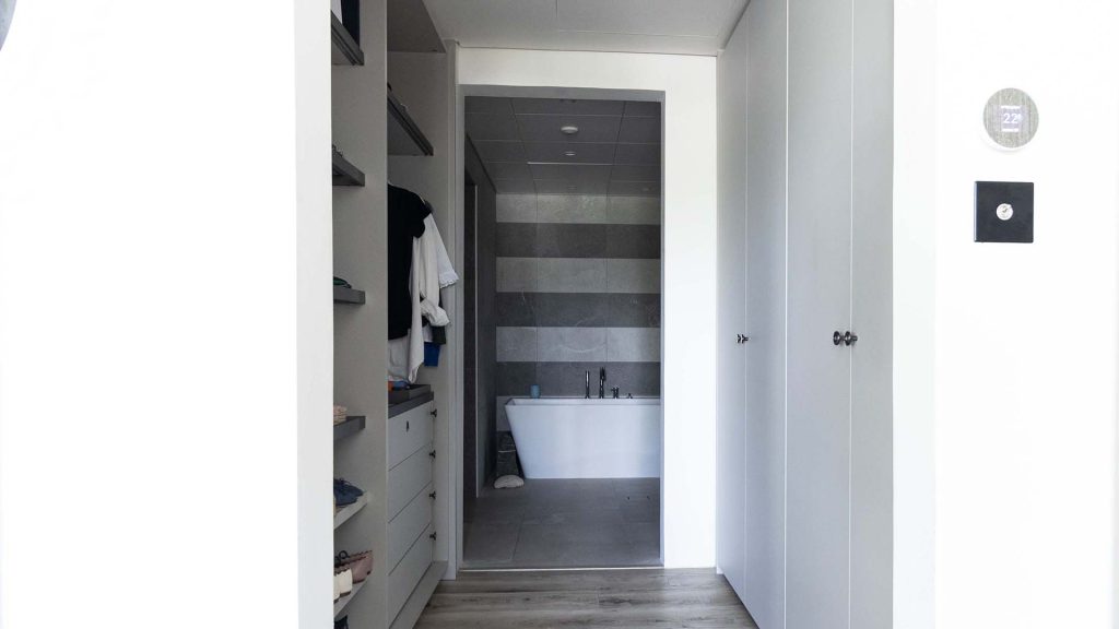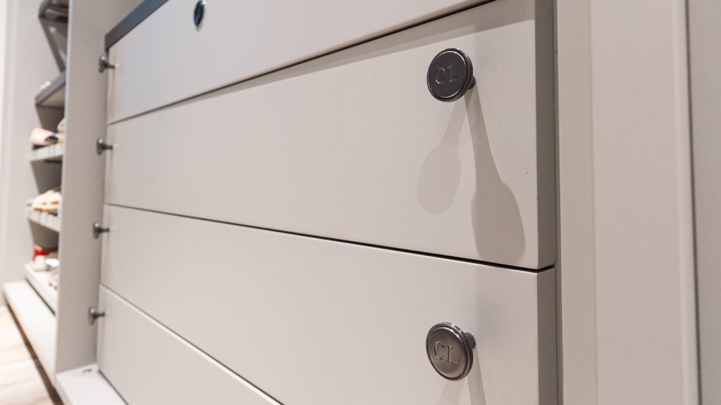 Designed exclusively for influencer Caroline Labouchere, this Ornare closet project at Jumeirah Islands in Dubai features a sophisticated grey color palette and Monogram collection handles with her initials elegantly engraved. The fully customized interiors include glass shelves framed in metallic grey, complete with built-in lighting, creating a luxurious and personalized space that exudes both style and functionality