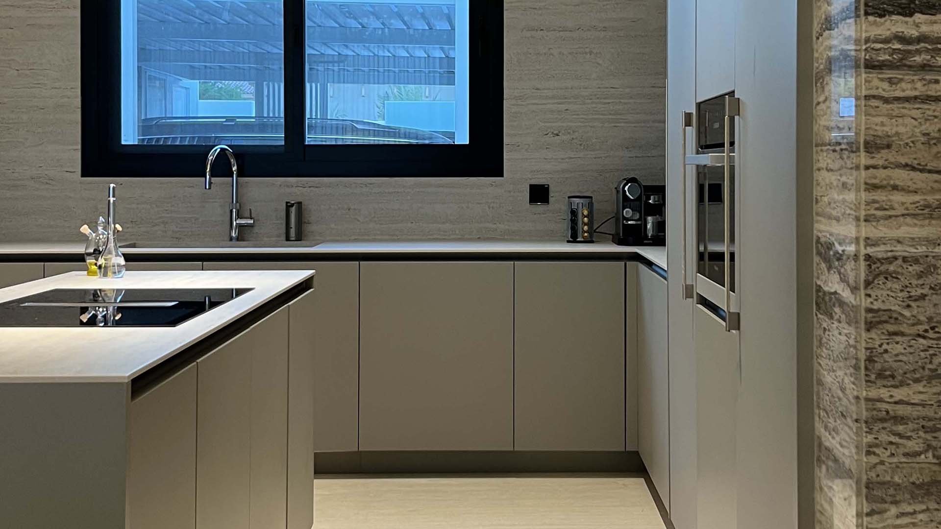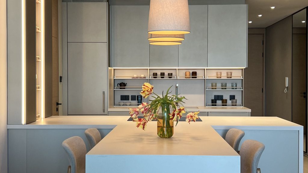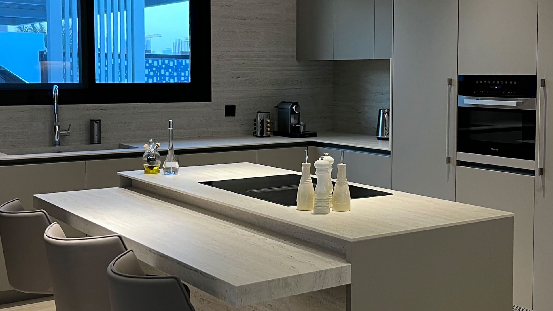 This Ornare kitchen and dining area, located in Nad Al Sheba and designed for a distinguished Dubai local family, features a muted neutral color palette that enhances both style and functionality. The kitchen is designed with practicality in mind, highlighted by a stunning Cosentino Marmorio stone countertop. Equipped with a Quooker multifunctional tap and top-of-the-line Miele appliances, this space seamlessly blends elegance with performance, creating the perfect setting for family gatherings and everyday living.