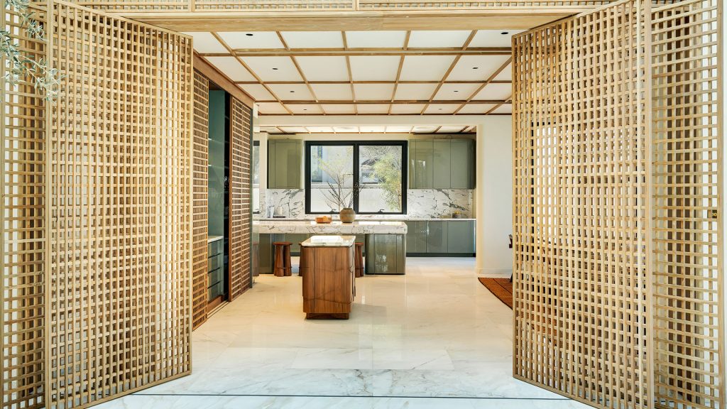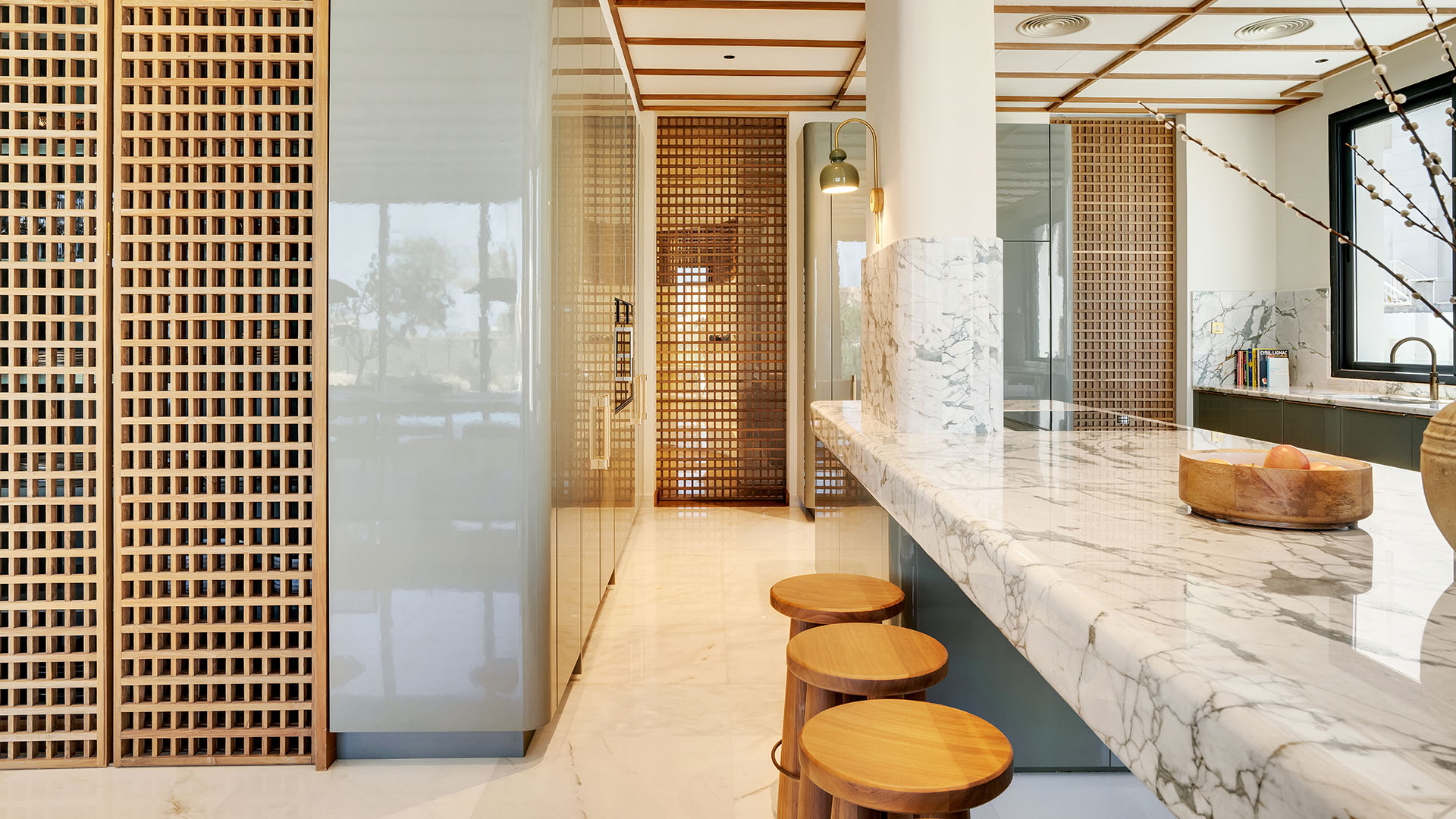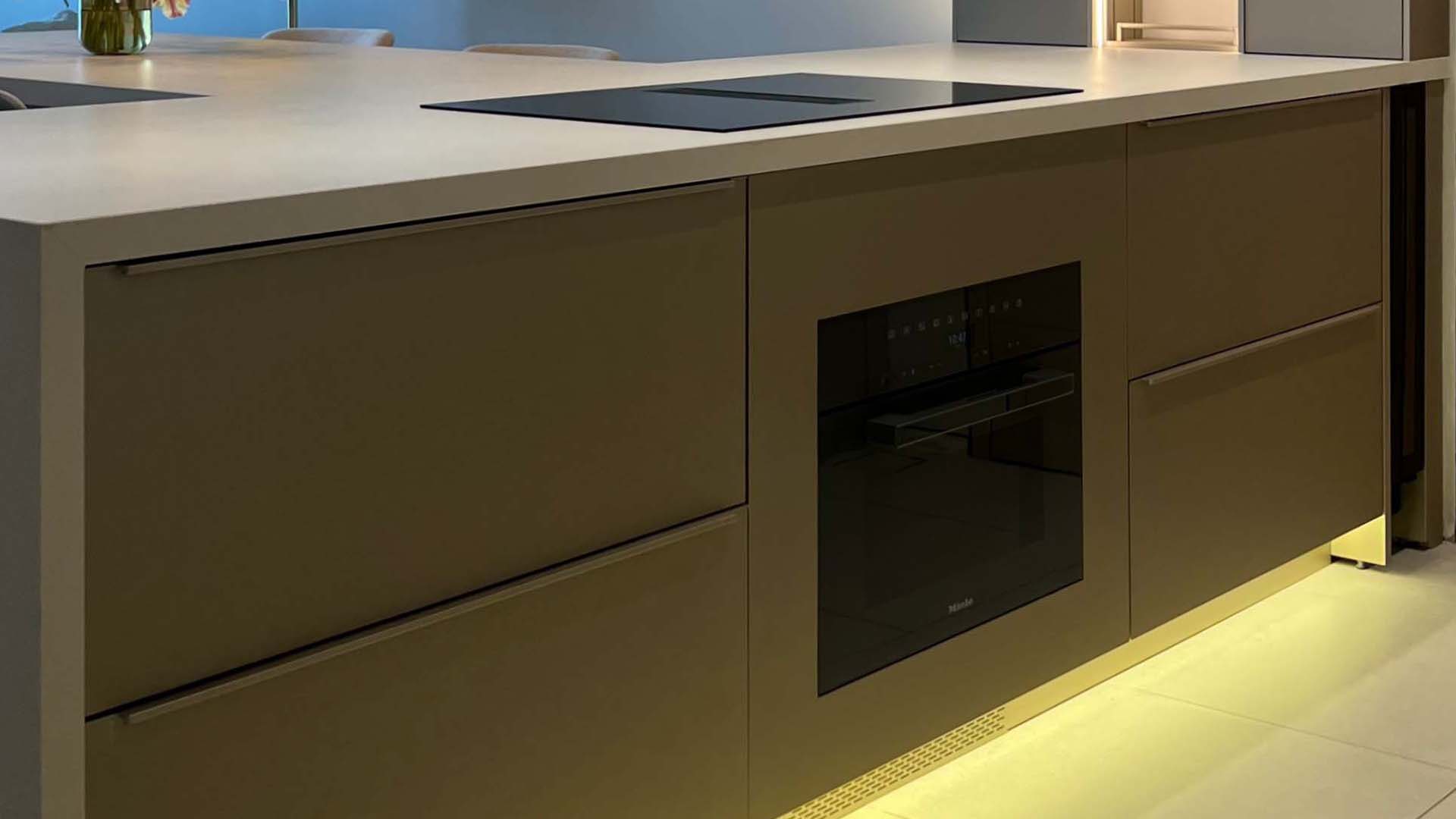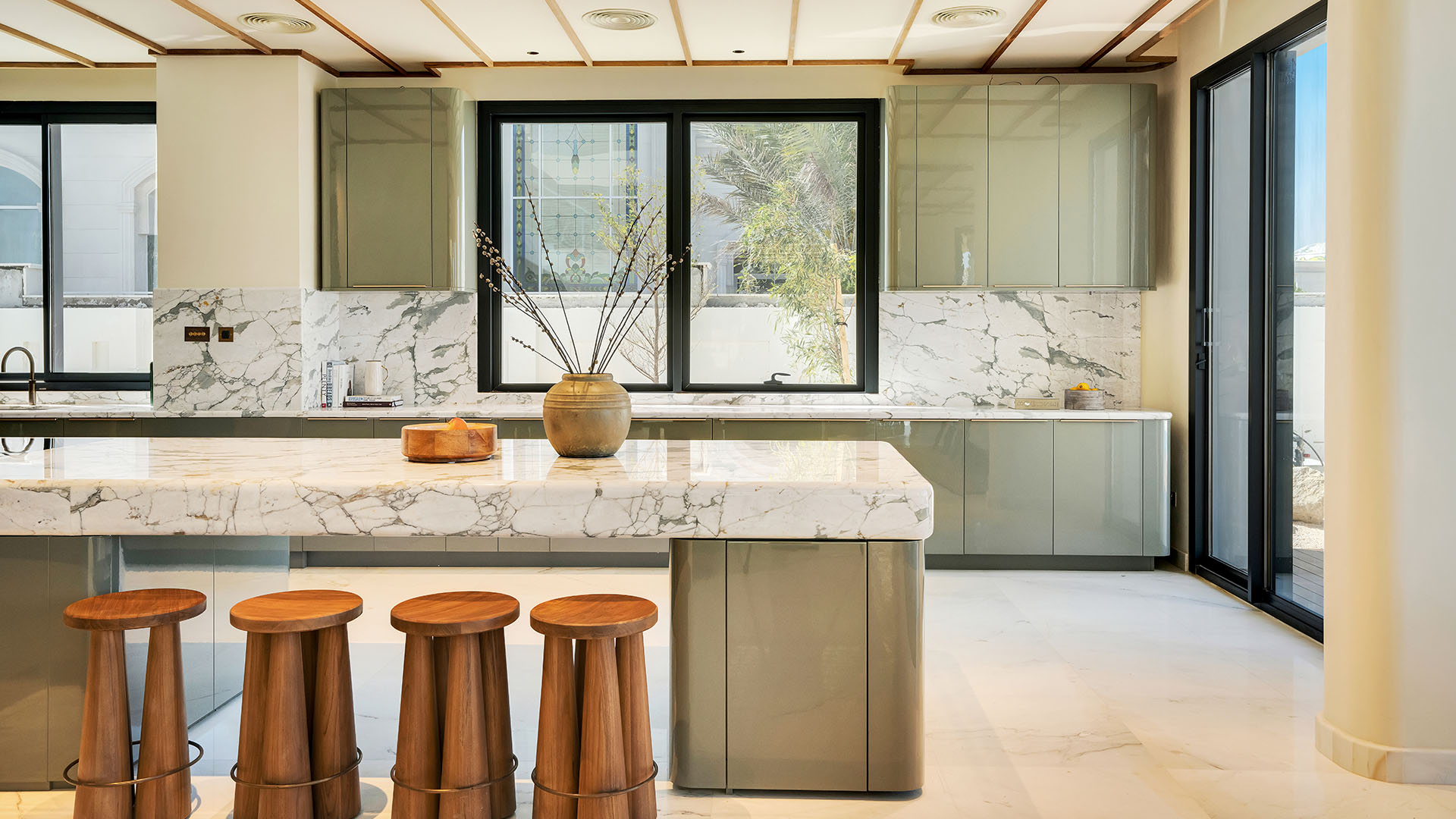 This Ornare kitchen and dining area, located in Nad Al Sheba and designed for a distinguished Dubai local family, features a muted neutral color palette that enhances both style and functionality. The kitchen is designed with practicality in mind, highlighted by a stunning Cosentino Marmorio stone countertop. Equipped with a Quooker multifunctional tap and top-of-the-line Miele appliances, this space seamlessly blends elegance with performance, creating the perfect setting for family gatherings and everyday living.