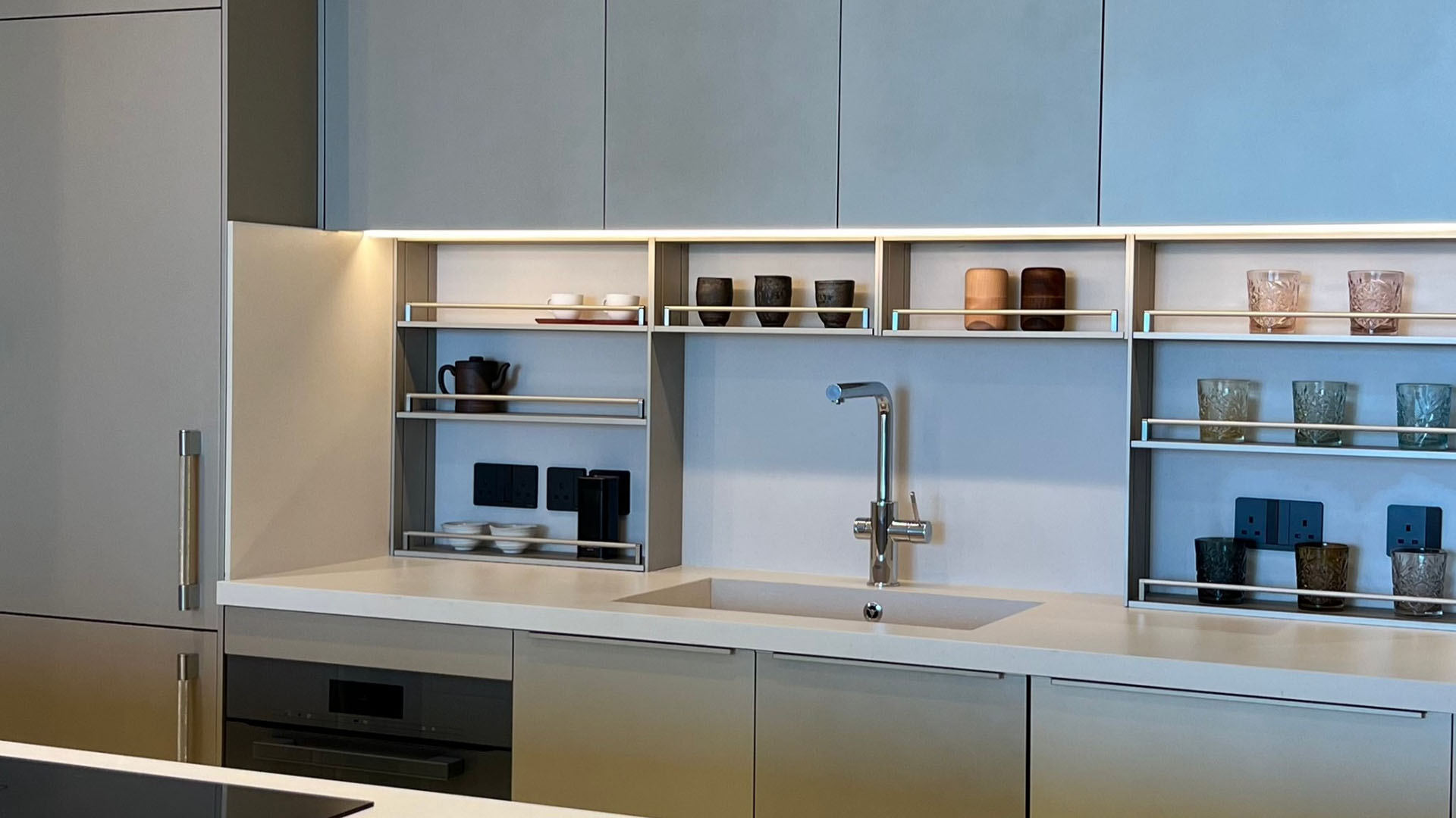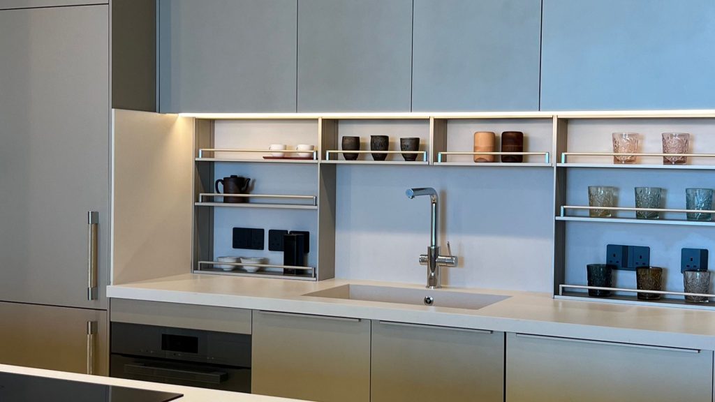 Experience the elegance of this Ornare kitchen project at the Dubai Marina location, featuring exquisite gold color for the shutters finishes and minimalist handles. Our exclusive Stow collection with glass shelves adds a touch of sophistication, perfectly complemented by high-performance Miele appliances. The special gold-colored Stilo handles further elevate the design, creating a stunning fusion of luxury and functionality.