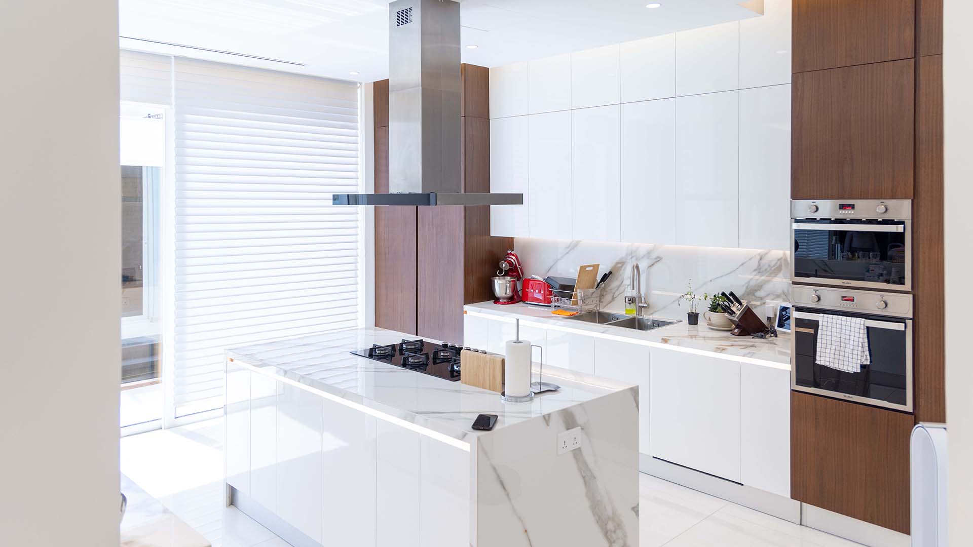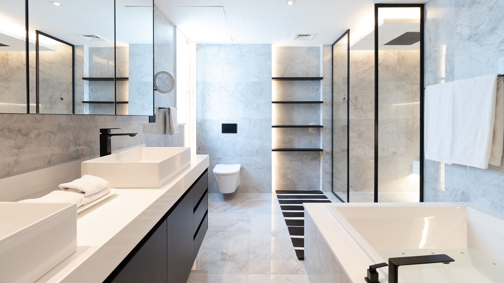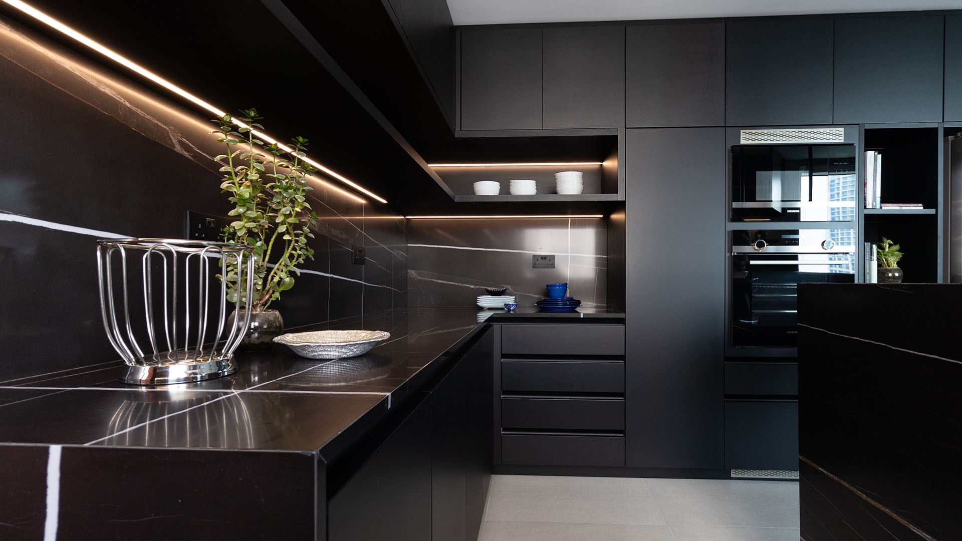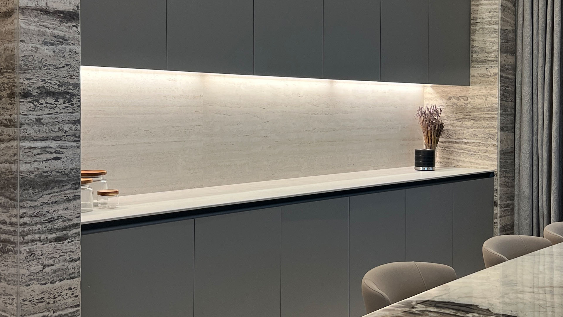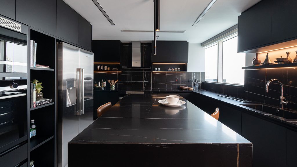 This project features a sleek, minimalist design for the kitchen and bathrooms of a luxury residence in Dubai Marina, using Ornare’s Stripe Collection. The cabinetry is defined by clean, horizontal lines, creating a bold yet refined look. The masculine aesthetic is enhanced through the use of monochromatic tones and geometric designs, exuding sophistication and strength. The kitchen combines style and functionality, featuring integrated high-end appliances and a Quooker tap for instant boiling water. The bathrooms offer a serene, spacious atmosphere. This design delivers modern luxury with a focus on simplicity and elegance.