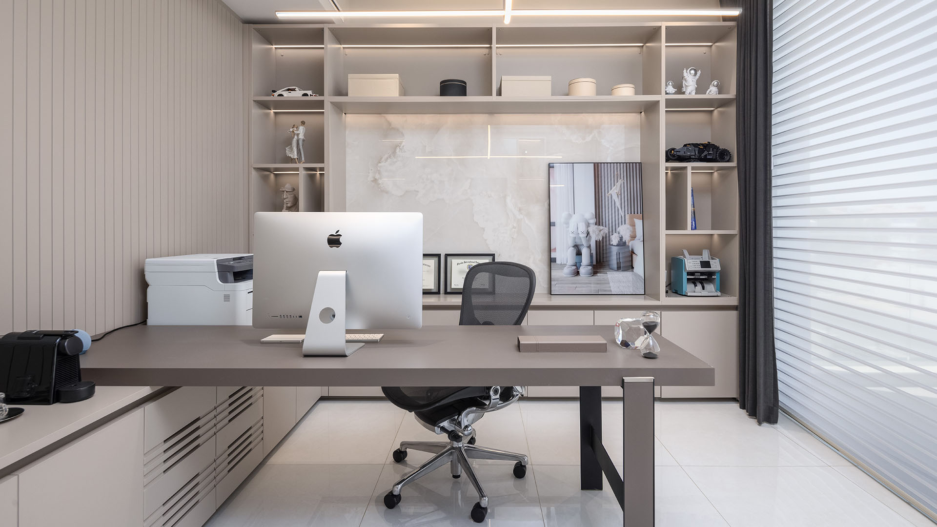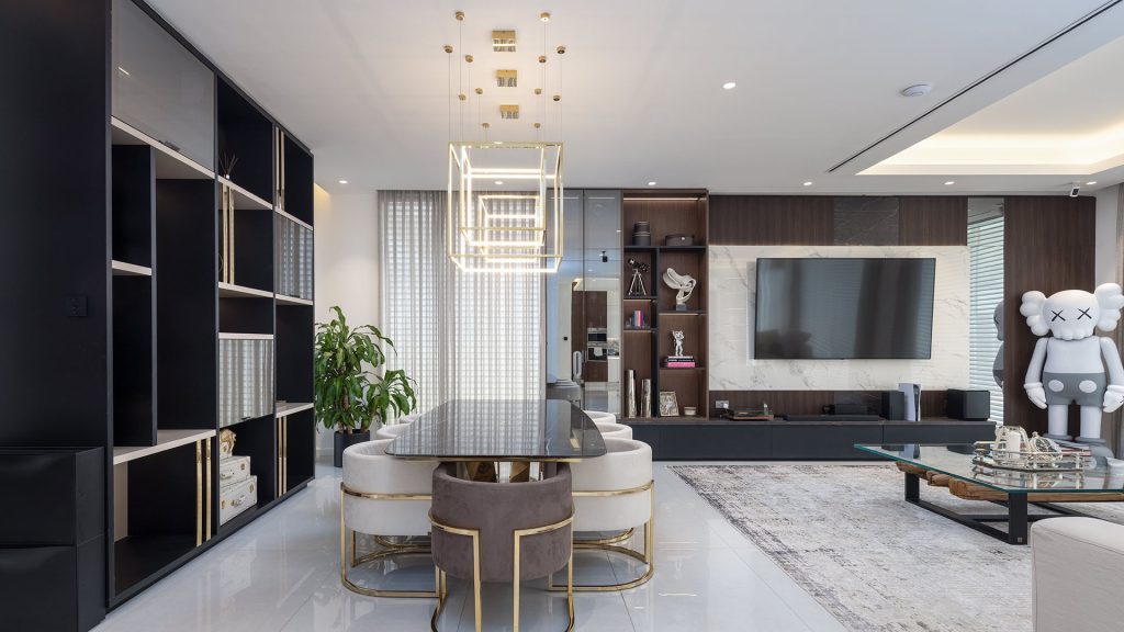 This Ornare project in Jumeirah Park, Dubai, was designed by renowned Brazilian architect Renato Smania for a young, talented entrepreneur who has just moved to the city. The project features sophisticated bedroom panelings and functional TV consoles, alongside a stylish game room designed with our Manhattan collection in chocolate panel color and silver aluminum frames. Ornare also contributed to the office, providing functional storage solutions and customized details for accessories, tailored to the client’s personal preferences. All TV panels are crafted with Cosentino stones, illuminated with LED backlighting, adding a touch of luxury and functionality to this exceptional space.